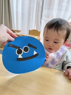 台紙を選び、鬼さんの目・口・眉毛を貼りつけます♪
