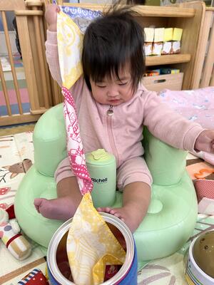 出して遊ぶだけでなく、布を中に入れて遊びを楽しむ姿も見られました🧡