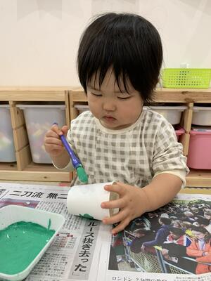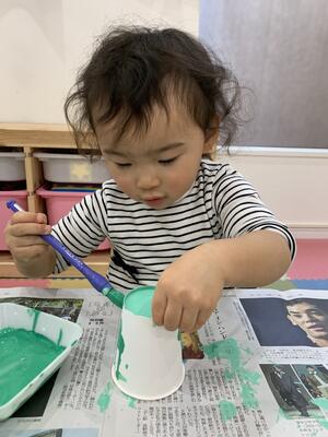 上手に筆を持ち、紙コップをクルクルと回しながら塗っていた子どもたち🖌✨