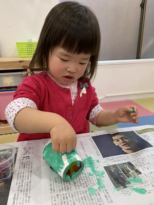 はじめに、筆を使って紙コップに緑色を塗りました🌲