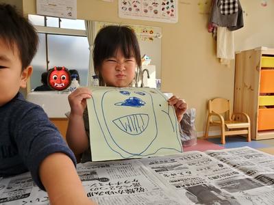 とお喋りしながら、様々な表情の鬼の顔を描く子どもたち😳♩